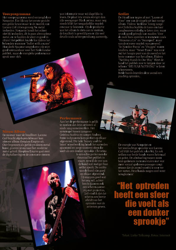 Mijn inspiratie komt uit tijdschriften. Ik heb in een boekhandel gewerkt, dus ik heb er genoeg gezien. Ik ben begonnen met het zoeken van afbeeldingen die ik kon gebruiken voor de achtergrond. Dit heb ik gedaan voor zowel de spread als de cover van het magazine. De oranje kleur die je ziet op de spreadpagina is de kleur van mijn favoriete album van deze artiest. De tekst op de spreadpagina is een concertreview die ik zelf heb geschreven.